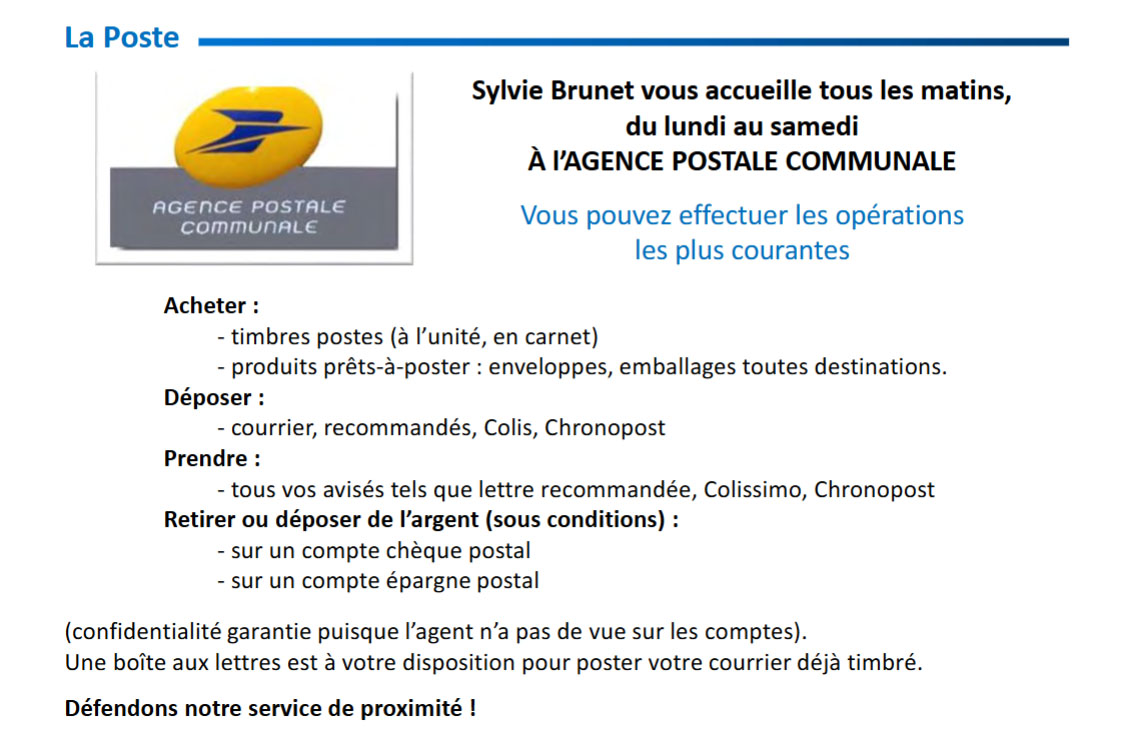 L’agence communale et le relais poste permettent aux habitants d’effectuer leurs opérations postales courantes dans un lieu pratique où ils accèdent en même temps à d’autres services.